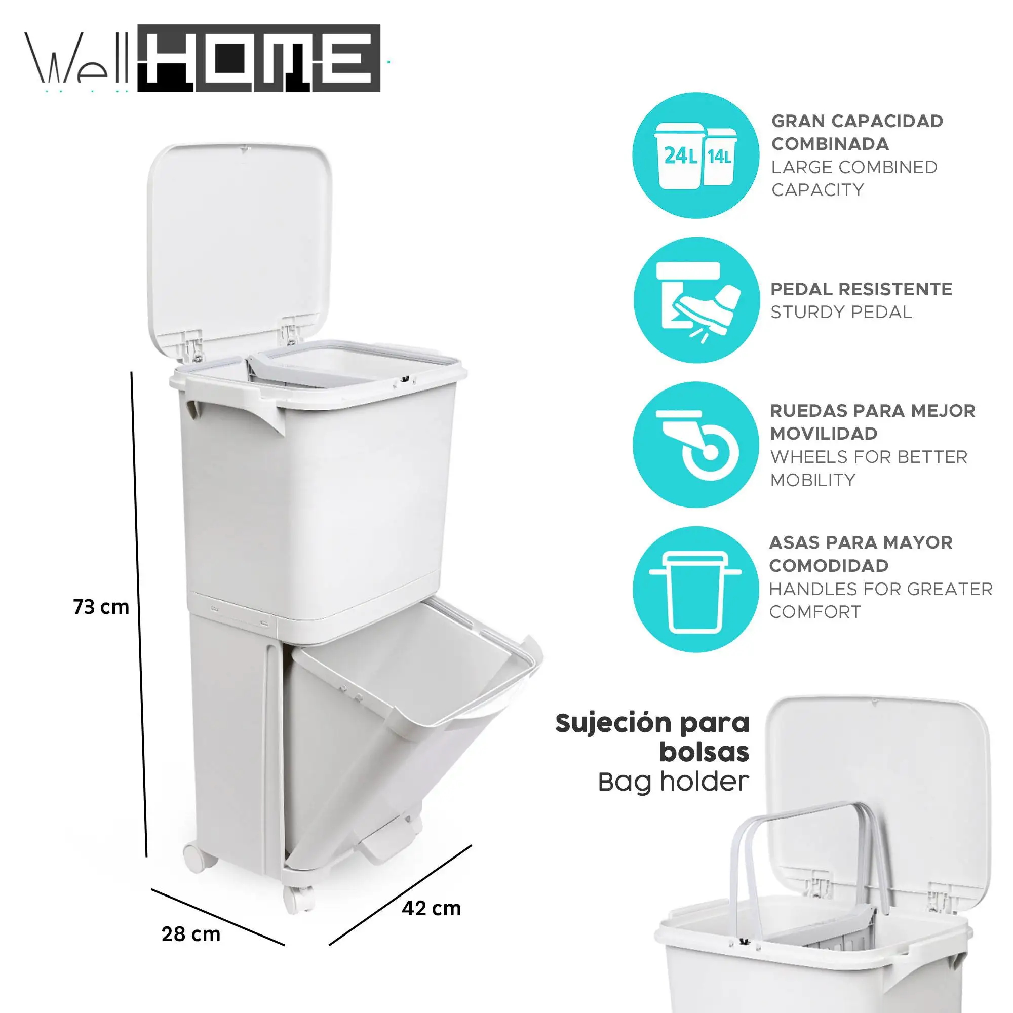• Está equipada con ruedas resistente y un asa para una fácil movilidad y una fácil clasificación y gestión de residuos.