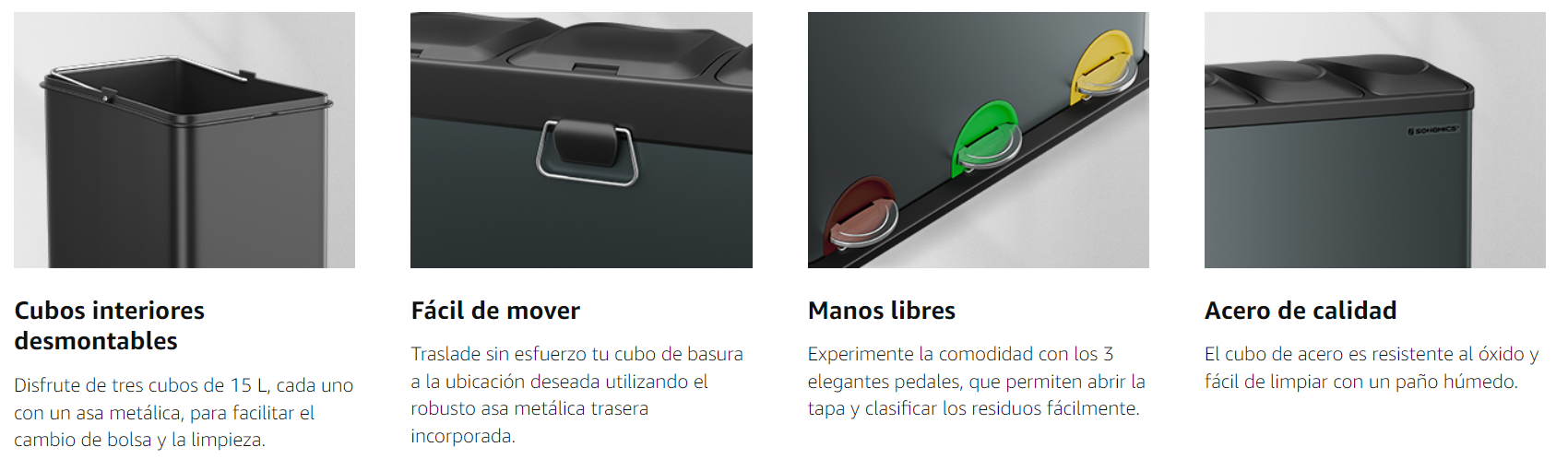 • 3 cubos interiores extraíbles con asas para sacar la basura fácilmente.